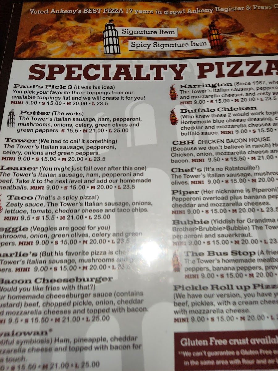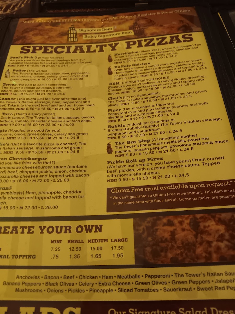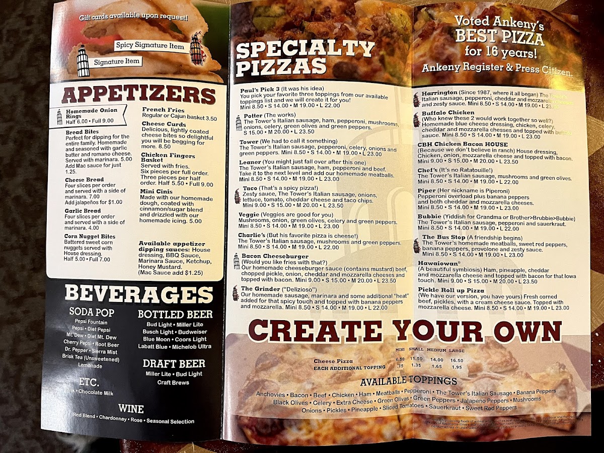 If you’re browsing the Leaning Tower Of Pizza - Uptown Ankeny Menu, get ready for the kind of comfort food that instantly feels familiar. Tucked away at 512 SW 3rd St, Ankeny, IA 50023, this spot lays out a lineup that’s all about classic flavors done right. The pizzas are the clear stars-loaded with gooey cheese, hearty toppings, and crusts that hit that perfect balance between crisp and chewy. Whether you’re into a simple pepperoni or something piled high with meats and veggies, there’s plenty to choose from.