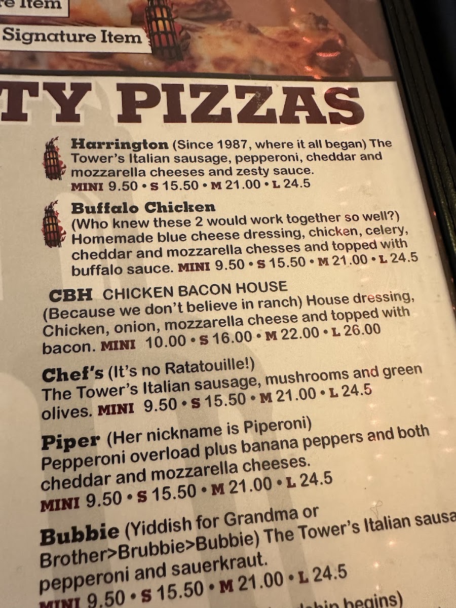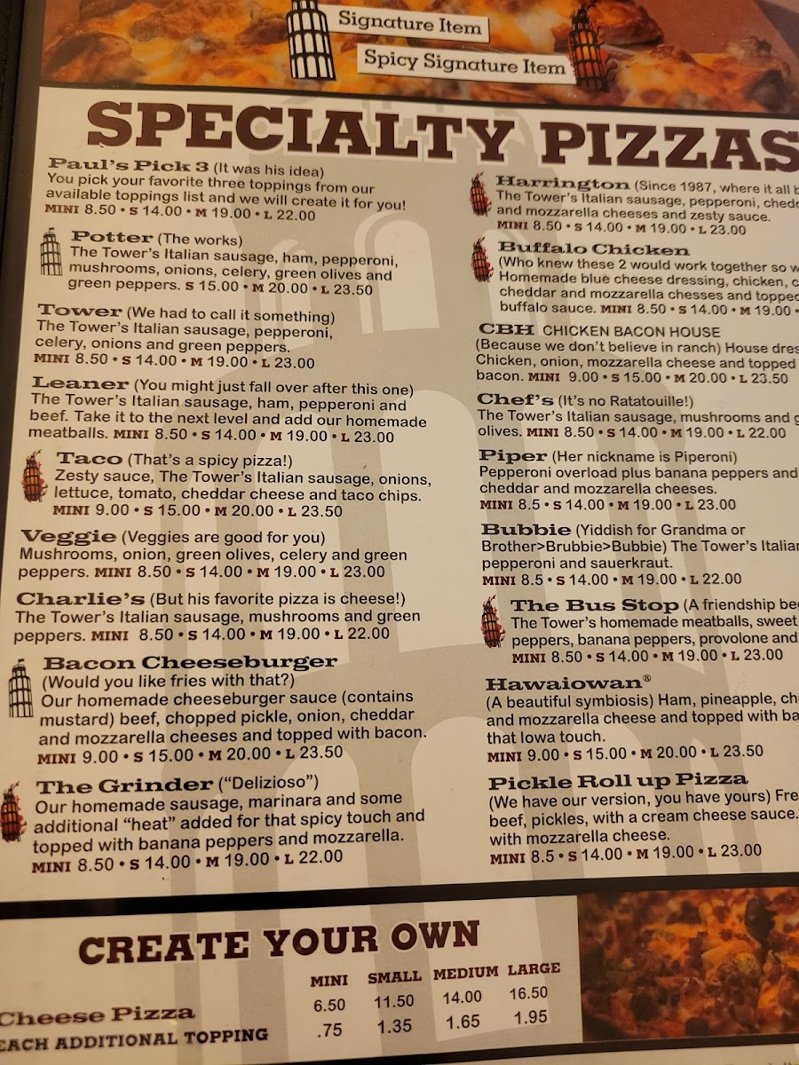 Since 1987, where it all began) The Tower's Italian sausage, pepperoni, cheddar and mozzarella cheeses and zesty sauce.